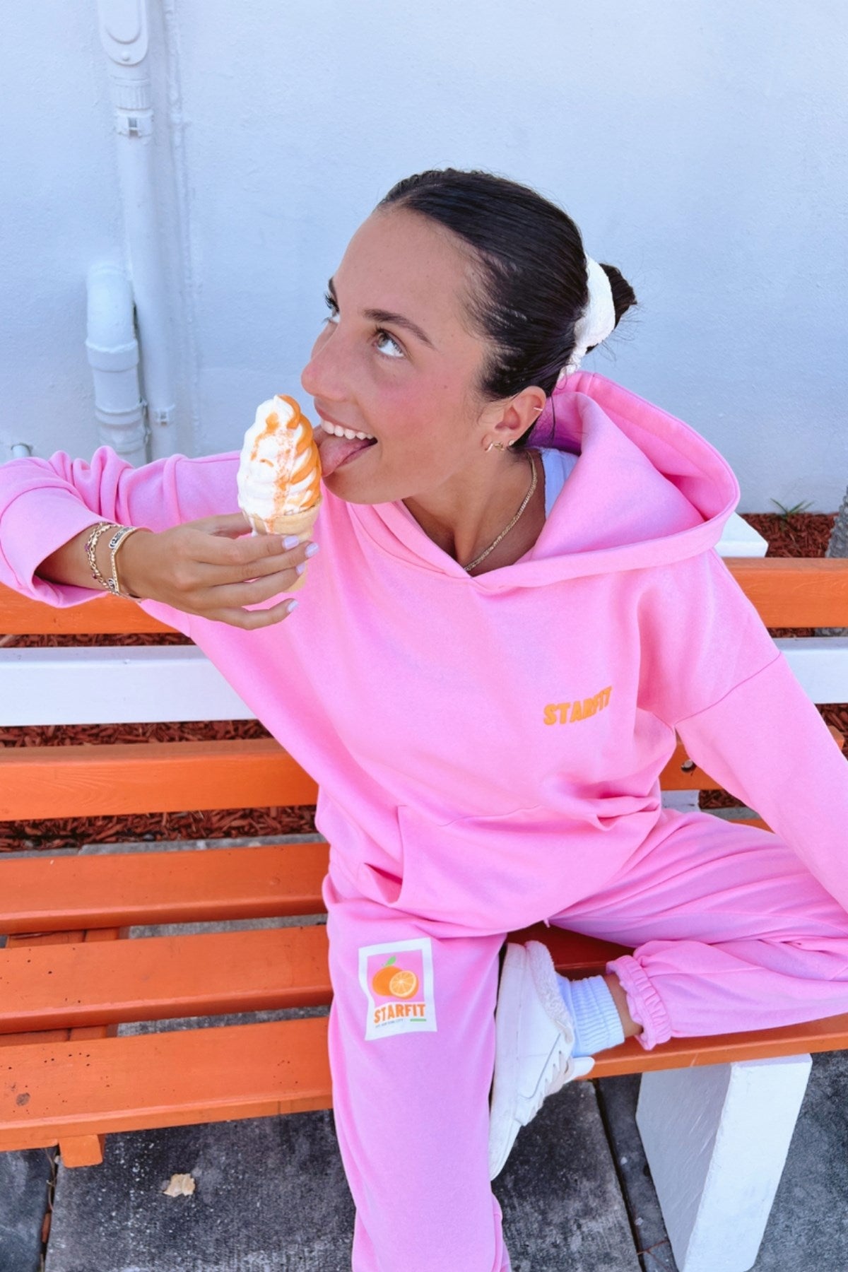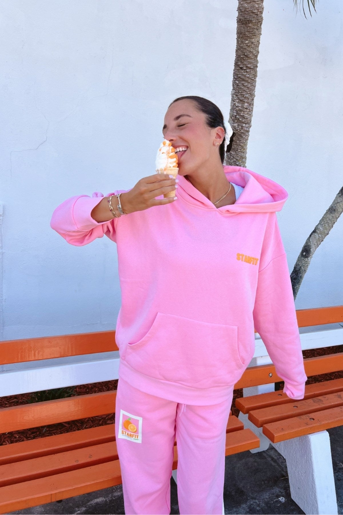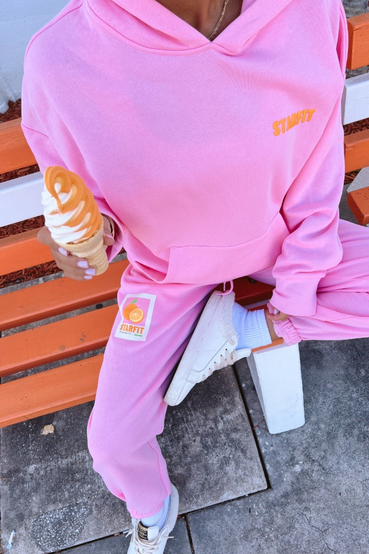 Oversize Kadın Eşofman Takımı Pembe - 3 İplik Şardonlu Polar, Kapüşonlu, Sırt Tam Portakal Baskı