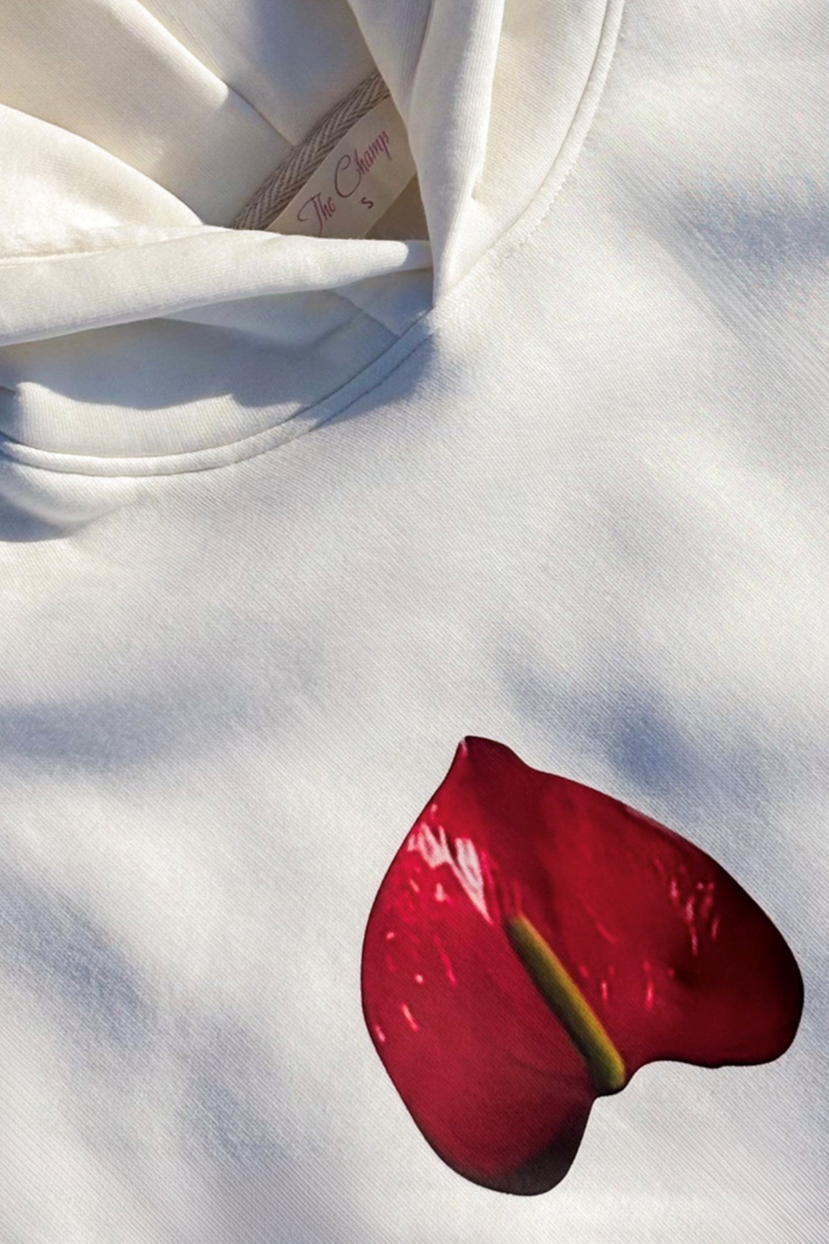 Oversize Kadın Sweatshirt Hoodie Flamingo Çiçeği Baskılı Beyaz – Kapüşonlu, Cepli, 3 İplik Polar