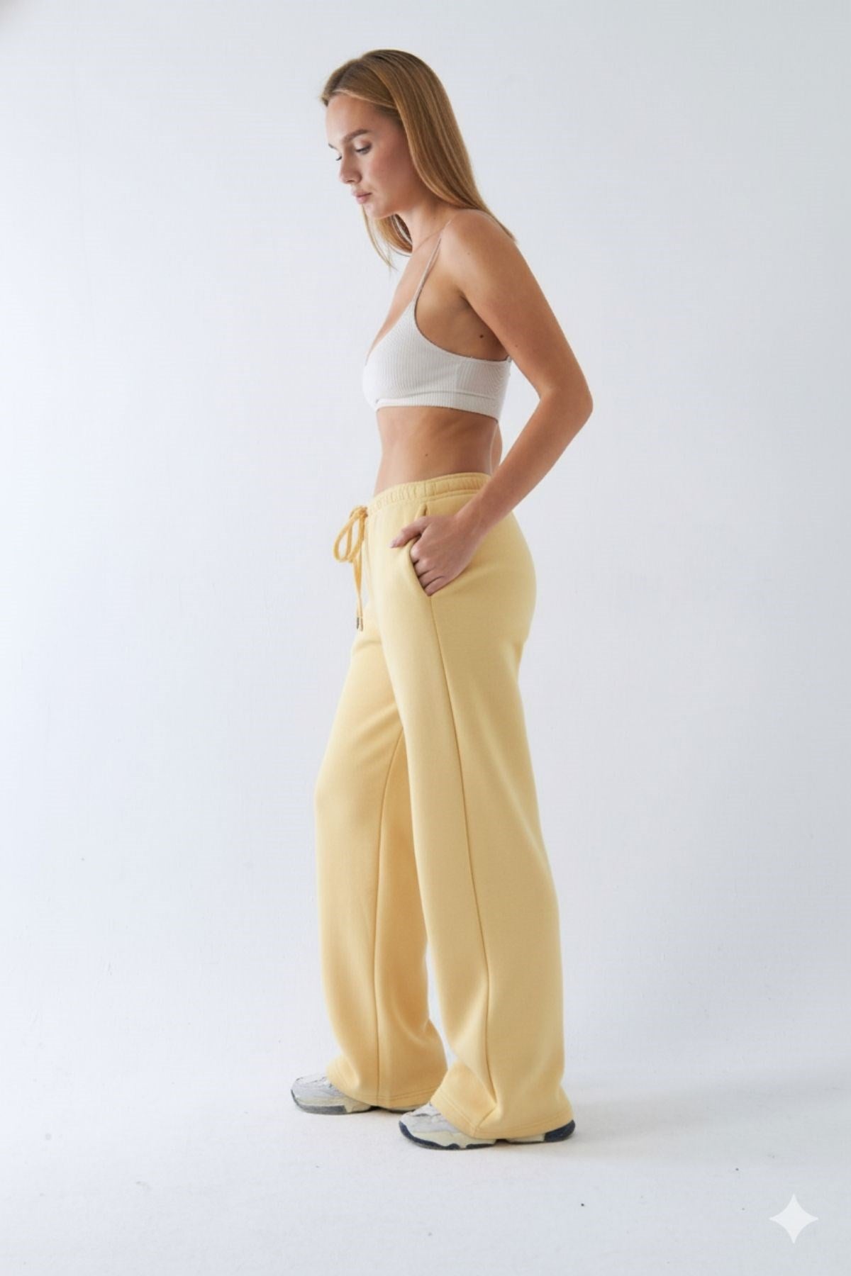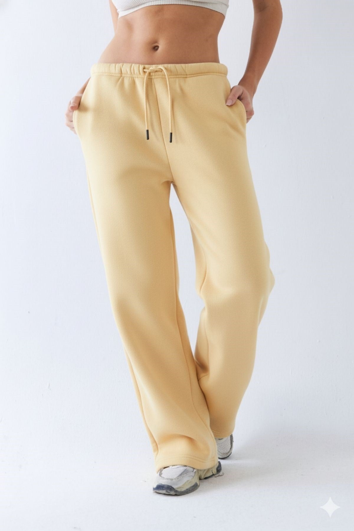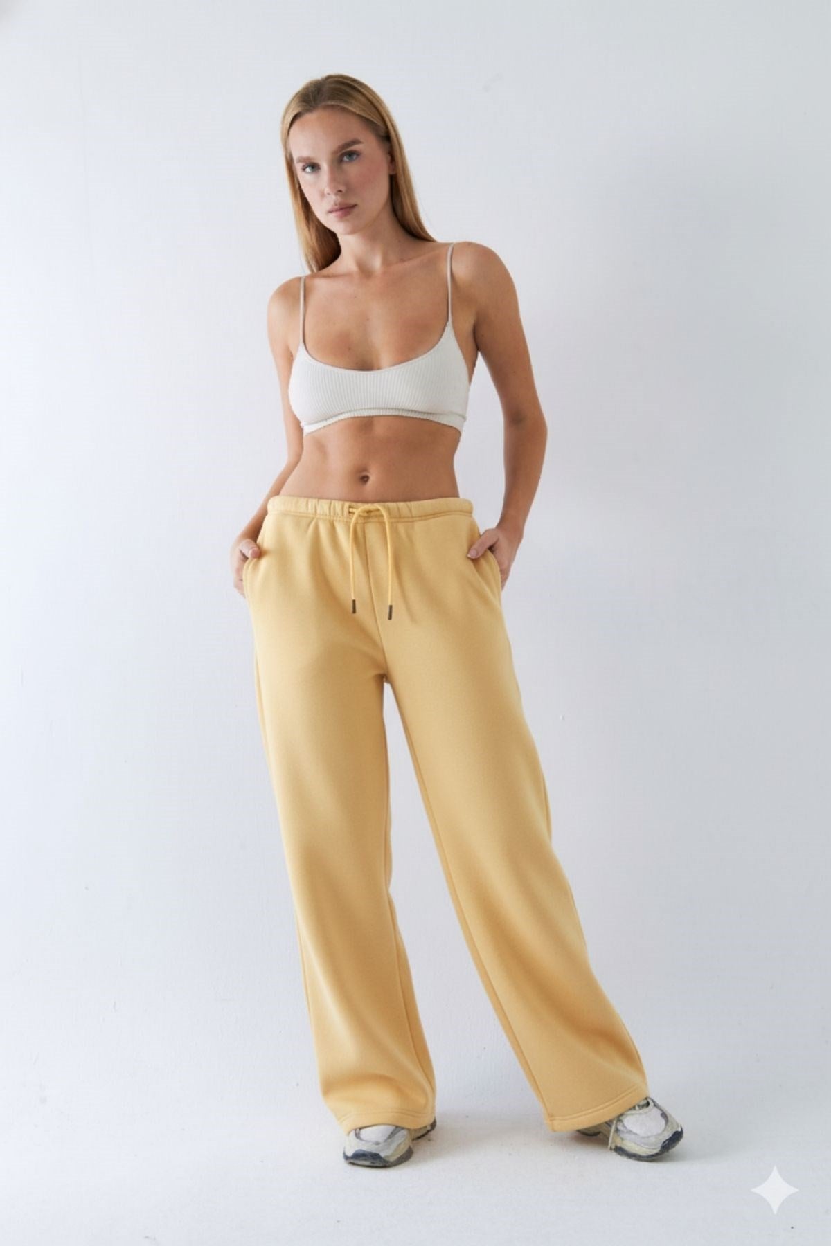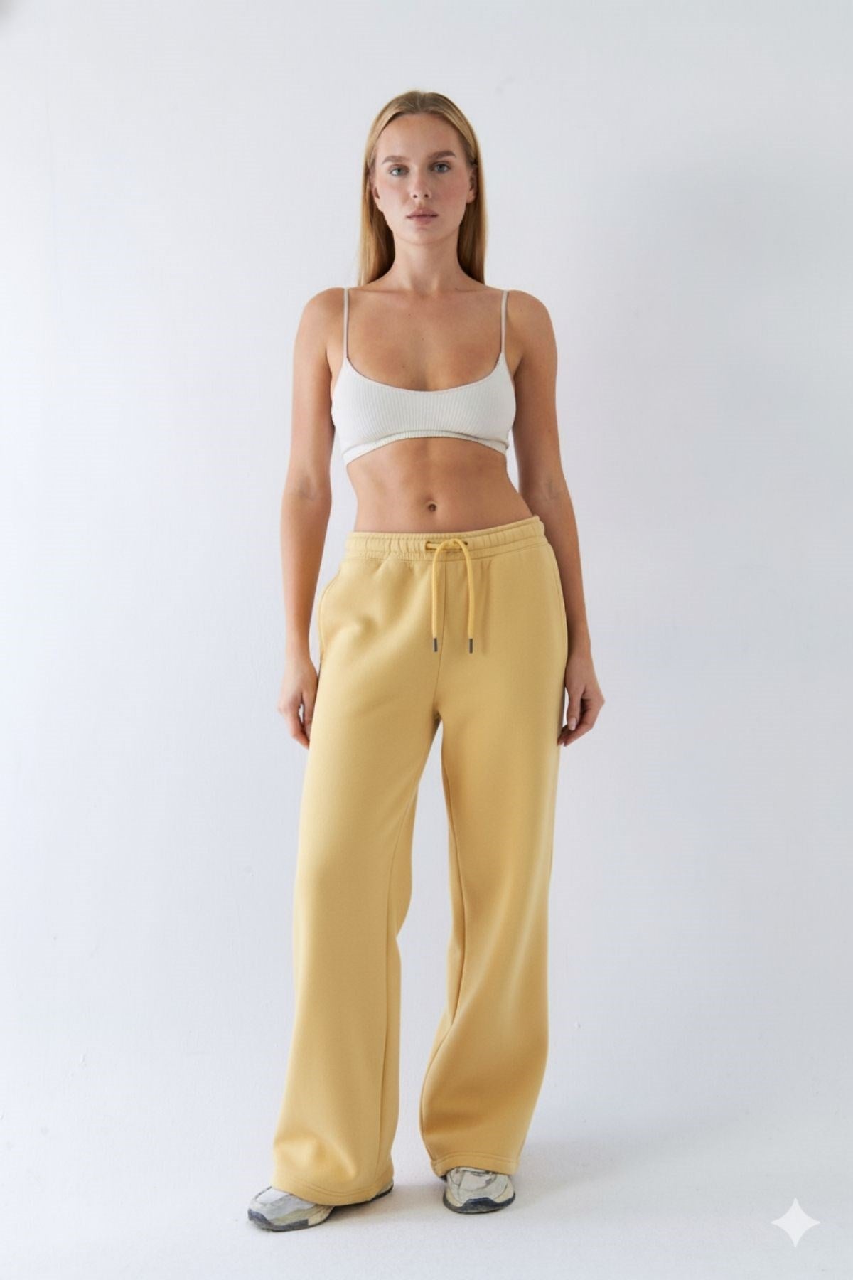 Oversize Unisex Eşofman Altı Sarı – 3 İplik Şardonlu Polar, Bol Paça, Cepli, Modern Rahat Kesim