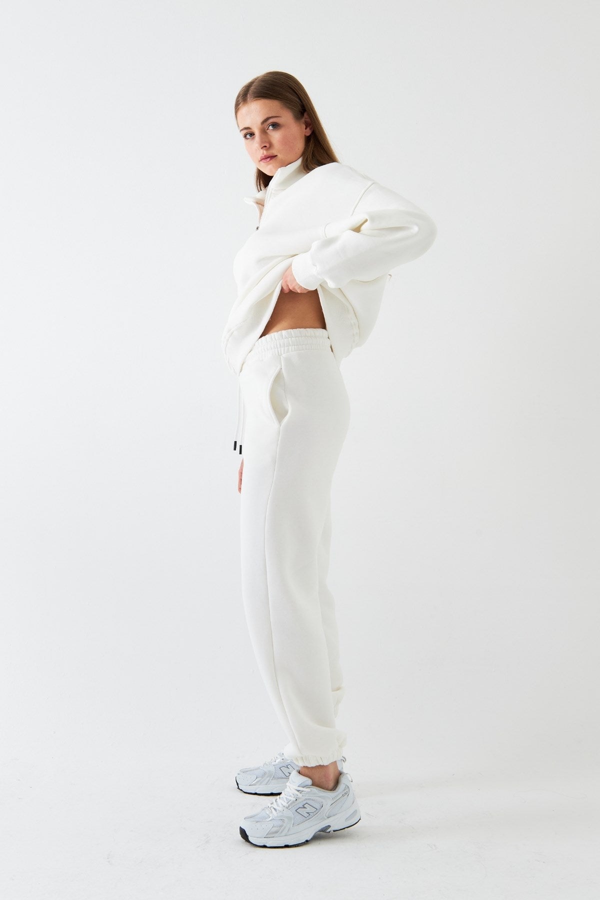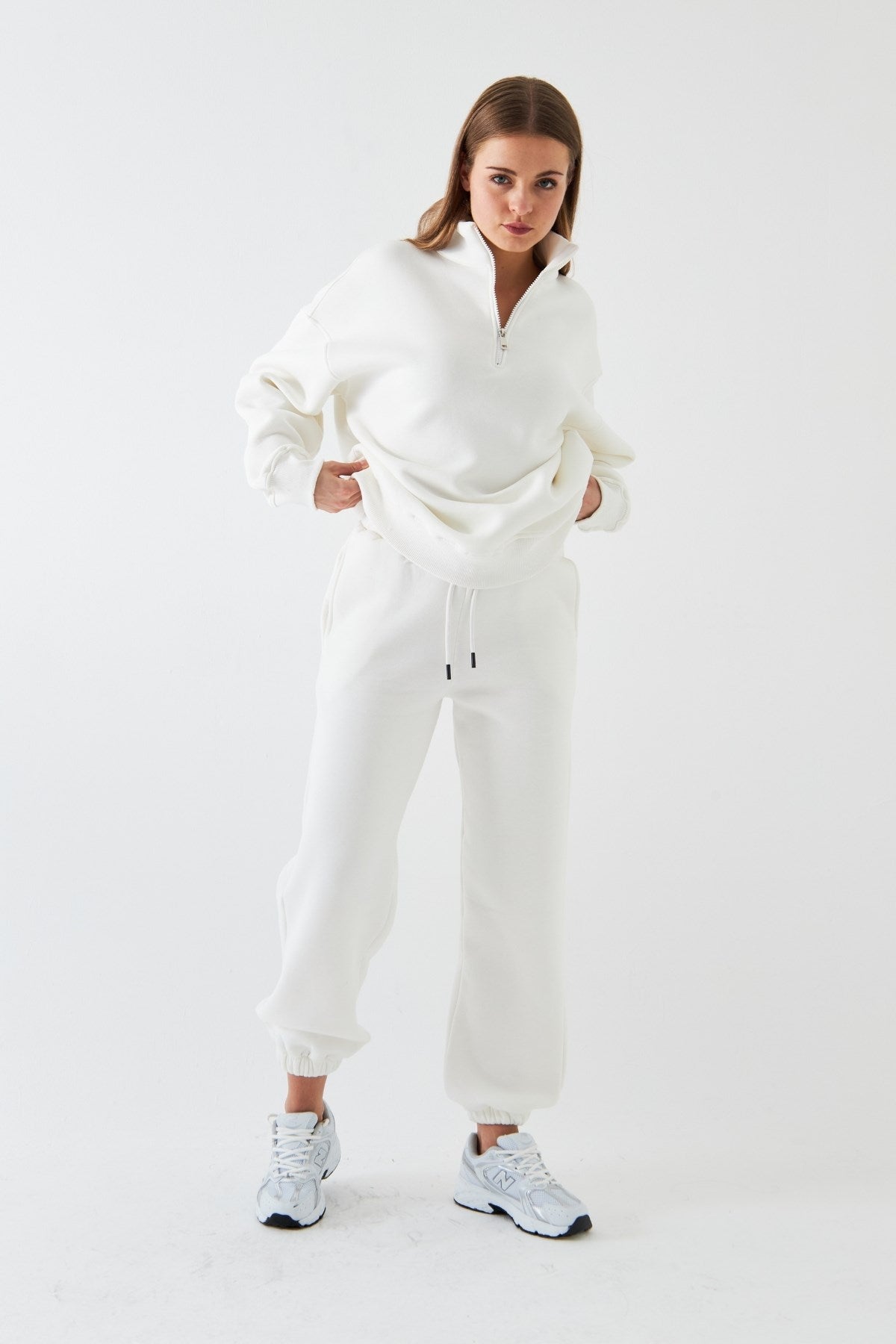 Unisex Oversize Eşofman Takımı Basic Beyaz – Fermuarlı Dik Yaka, Lastikli Paça, 3 İplik Şardonlu Polar