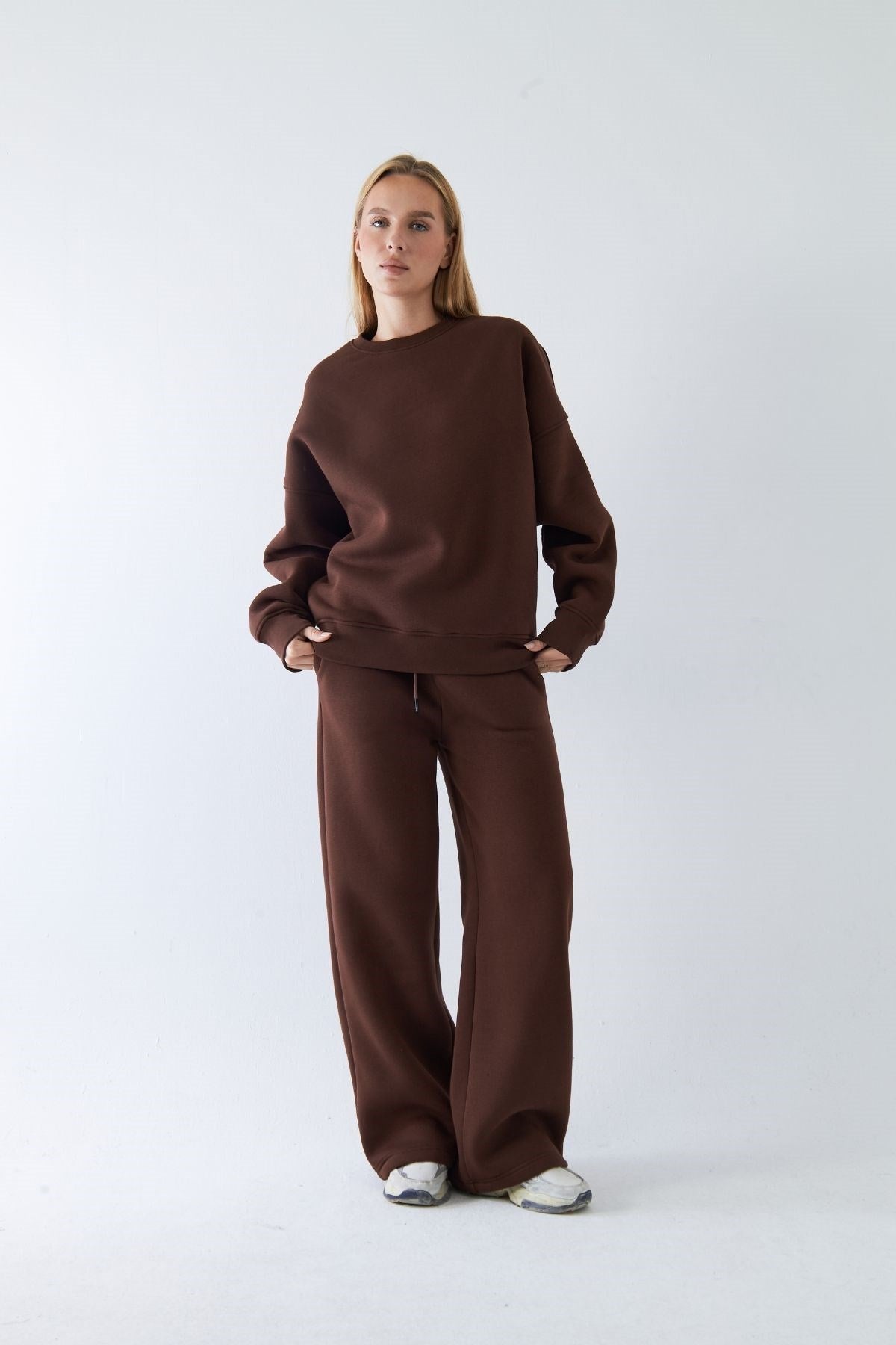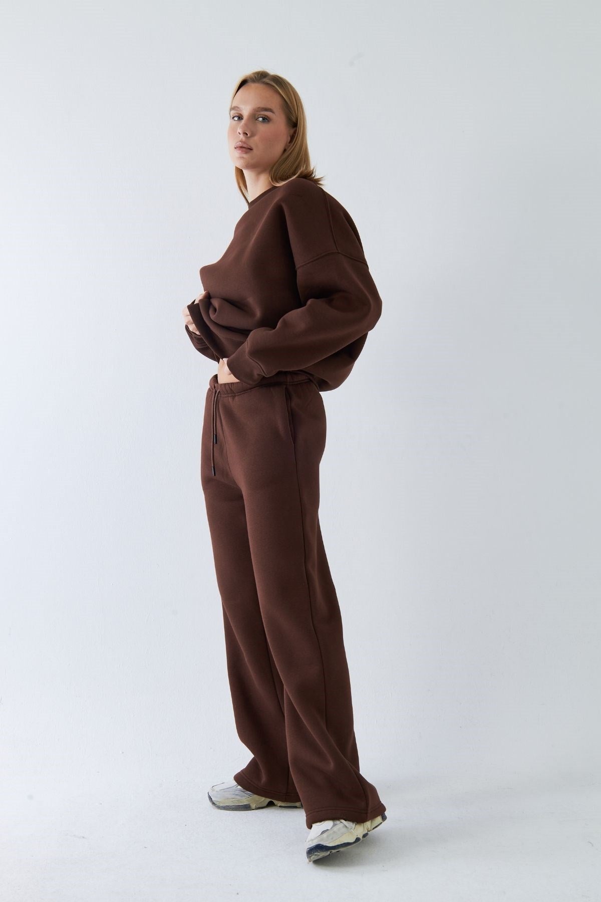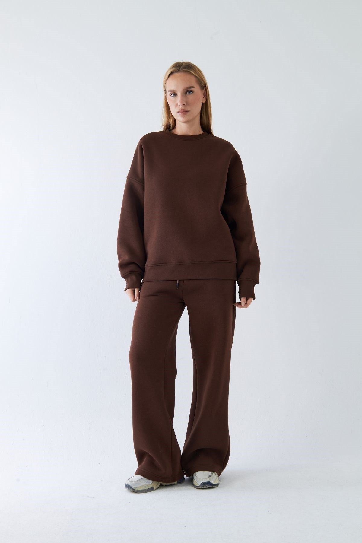 Unisex Oversize Eşofman Takımı Basic Kahverengi – Bisiklet Yaka, Bol Paça, 3 İplik Şardonlu Polar