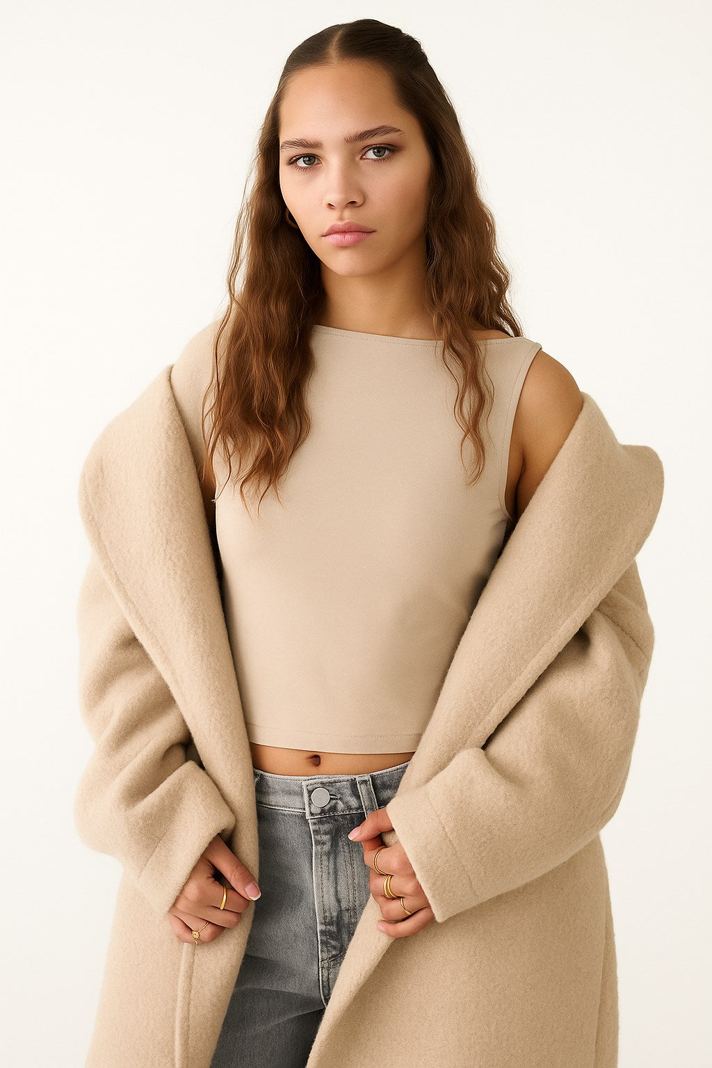 Yuvarlak Yaka Zarif ve Minimal Kolsuz Bej Bluz